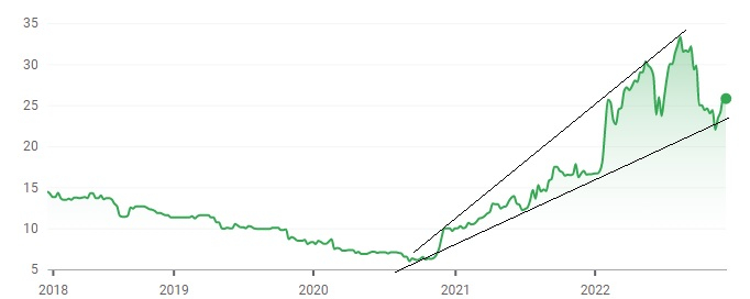 Le biseau d'élargissement haussier est formé par les oscillations comprises entre deux droites de tendance haussières divergentes :